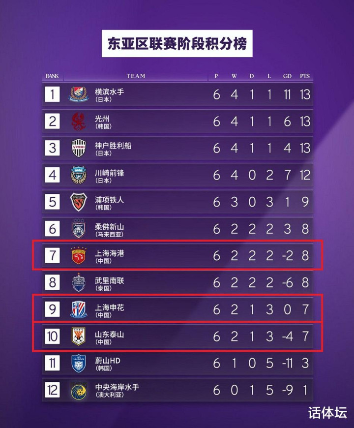 积分榜上:横滨水手、光州FC、神户得手船同积13分,位列前三位;川崎时尚积12分紧随后来,浦项制铁积9分位列第5位;而柔佛新山、上海海港和武里南联积8分,分列6到8位。上海申花和山东泰山同积7分,位列第9和第10;蔚山HD和中央海岸水手,积3分和1分。