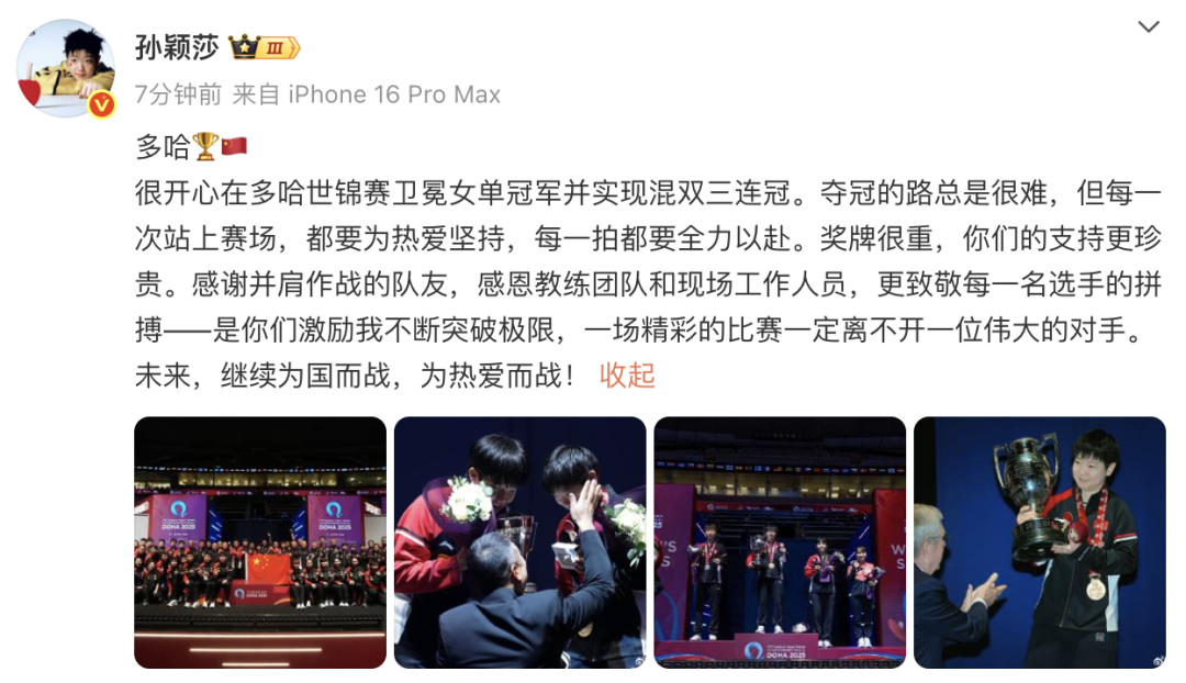 26日,孙颖莎发文:“很愉快在多哈世锦赛卫冕女单冠军并好意思满混双三连冠。夺冠的路老是很难,但每一次站上赛场,王人要为细心坚执,每一拍王人要任重道远。奖牌很重,你们的复旧更迥殊。感谢并肩战争的队友,感德栽种团队和现场责任主谈主员,更请安每别称选手的拼搏——是你们激发我不断打破极限,一场精彩的比赛一定离不开一位伟大的敌手。将来,不时为国而战,为细心而战!”