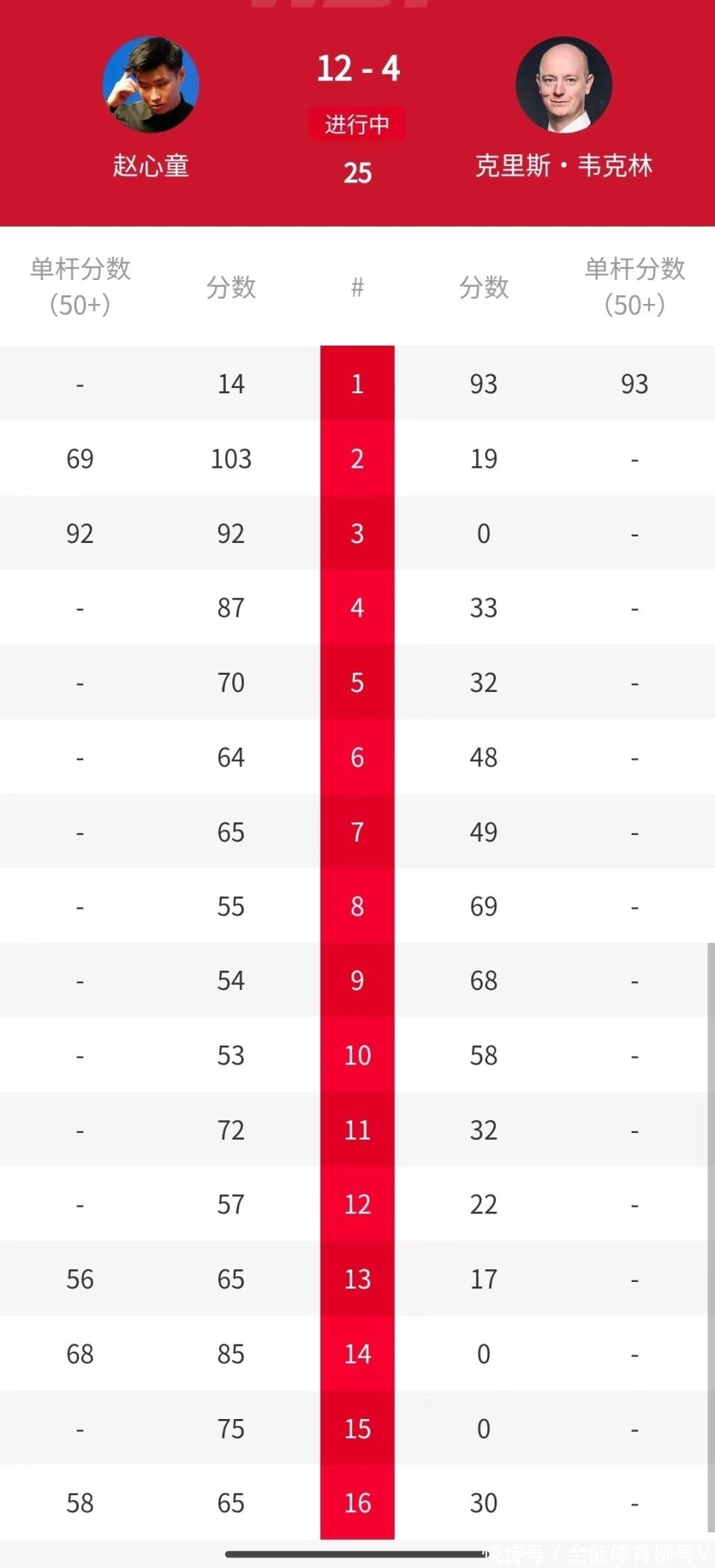 比赛第一局,艾伦开局手感冰凉,韦克林则是强势发力,他打出单杆56分,68-49先拔头筹,1-0越过。第二局,韦克林又打出单杆69分,73-0/零封韦克林,2-0越过。第三局,开场连丢两局之后,艾伦终于有所斩获,他轰出单杆100分,124-12扳回一局,比分追成1-2。