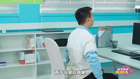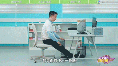 治愈座椅位置,与办公桌保持一定距离。坐在椅子上,上前伸出一条腿,勾起脚尖,两手并拢,上前伸,躯干上前,双手触摸脚尖,感受大腿的拉伸感。保持在终局位置,深呼吸2-3次后,拉伸另一条腿。